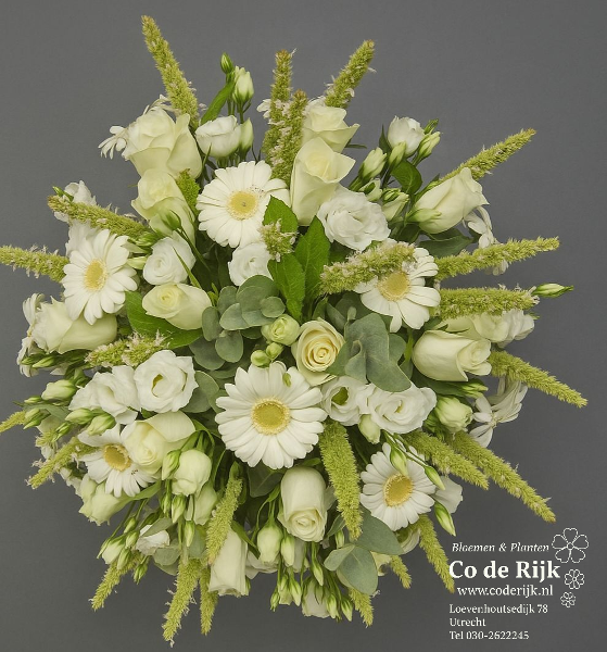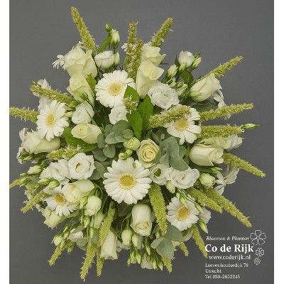 Biedermeier van witte roosjes Gerbera en andere witte roosje incl bedrukt rouwlint