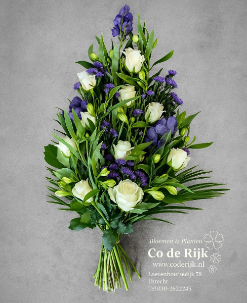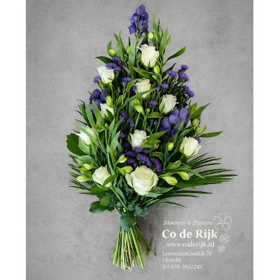 Rouwboeket in paars blauw wit kleuren, waarbij de grootste maat inclusief rouwlint is , deze kunt u invullen bij kaart tekst